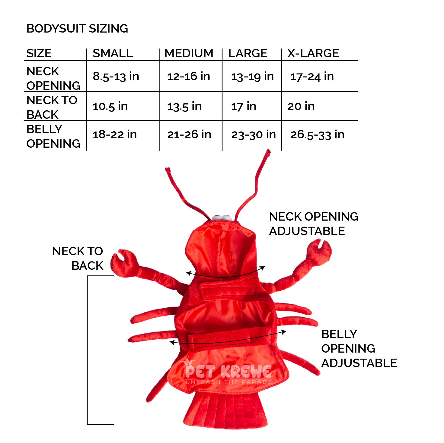 Pet Krewe’s Dog Lobster Costume is a cute and hilarious Halloween costume for your dog! This shiny bright red lobster dog costume will look great on any pet. It is a one piece, hoodie style costume with hook and loop straps at the neck and belly to ensure proper fit. This dog lobster costume is available in four sizes: Small, Medium, Large and Extra Large.